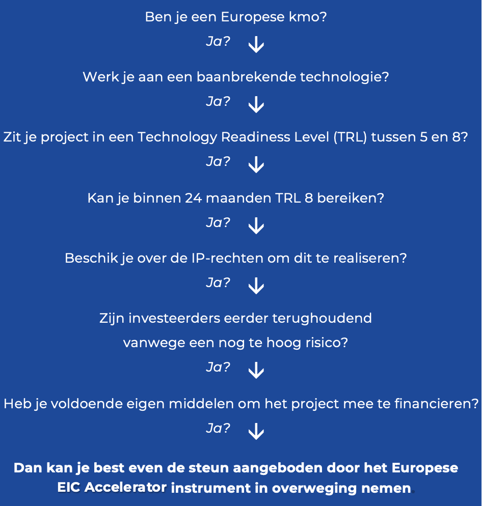 Wij kijken graag vrijblijvend of jouw project past binnen de EIC criteria. Indien dit niet het geval zou zijn, bekijken we graag of er andere subsidiekansen bestaan voor de groeiambities.